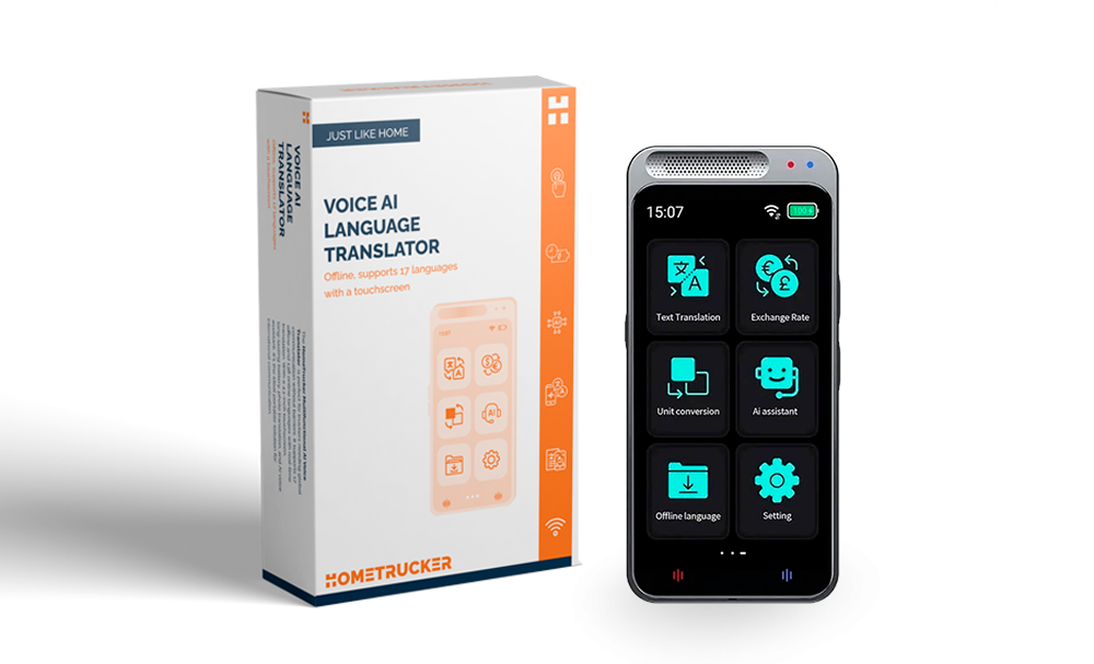 Comunícate en la ruta con cualquier persona de cualquier país con el traductor de idiomas por Voz sin conexión Multifuncional con Inteligencia Artificial HomeTrucker. Soporta 17 idiomas offline, tiene pantalla táctil y funciona también sin internet, ideal para camioneros.